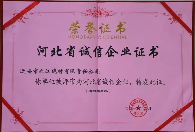 近日,由河北省誠(chéng)信企業(yè)評(píng)選委員會(huì)辦公室聯(lián)合河北省整頓和規(guī)范市場(chǎng)經(jīng)濟(jì)秩序領(lǐng)導(dǎo)小組辦公室、河北省企業(yè)家協(xié)會(huì)組織召開(kāi)的“河北省企業(yè)誠(chéng)信建設(shè)經(jīng)驗(yàn)交流會(huì)”在石家莊市隆重舉行。會(huì)上,遷安市九江線材有限責(zé)任公司被大會(huì)評(píng)選為“2018年河北省誠(chéng)信企業(yè)”,公司總經(jīng)理助理呂冬榮獲“河北省企業(yè)誠(chéng)信建設(shè)優(yōu)秀工作者”榮譽(yù)稱(chēng)號(hào)。